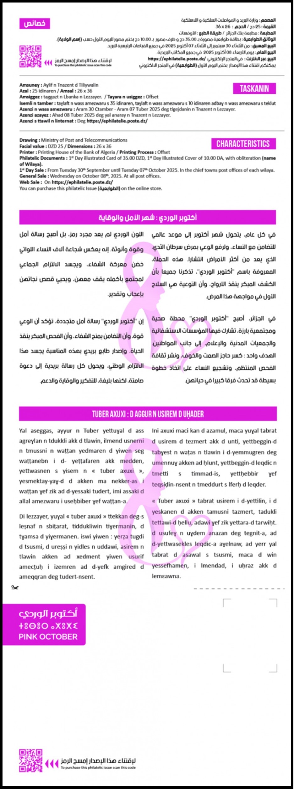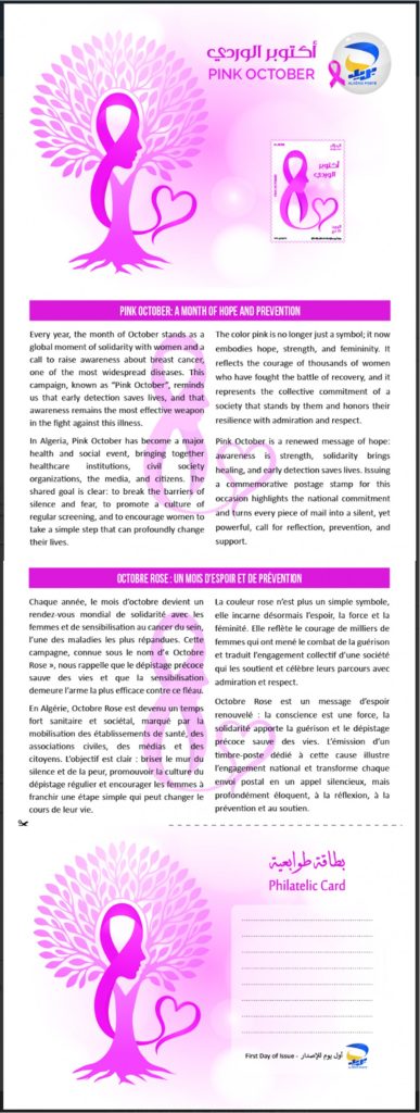 وواصل زروقي “وإصدار طابع بريدي تذكاري لهذه المناسبة يجعل من كل رسالة تصل، نداءً صامتاً لكن قويّاً للتفكير، والوقاية. والدعم، لنجعل من أكتوبر رسالة أمل متجدّدة: التوعية قوة، التضامن شفاء، والكشف المبكر حياة”.