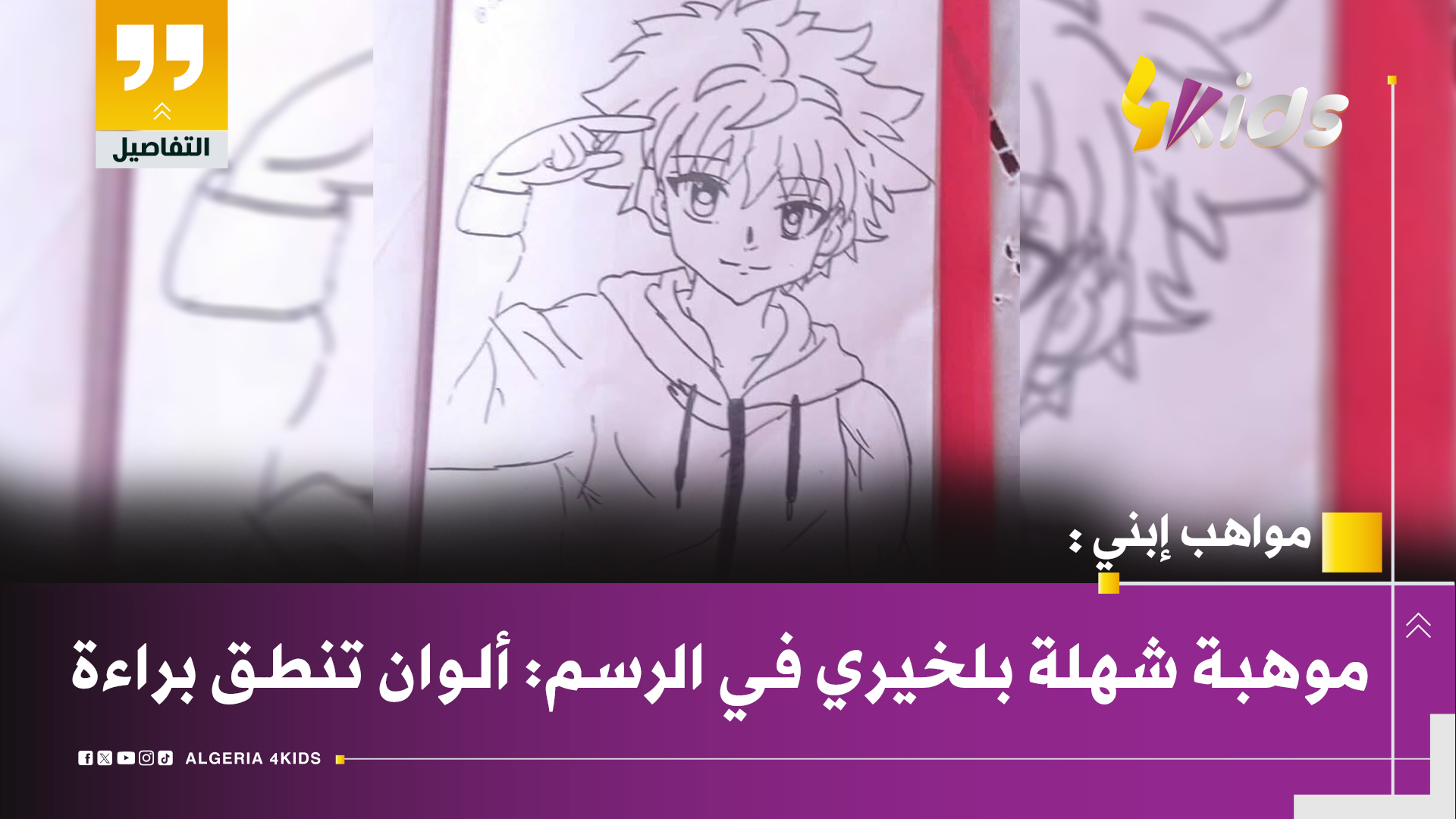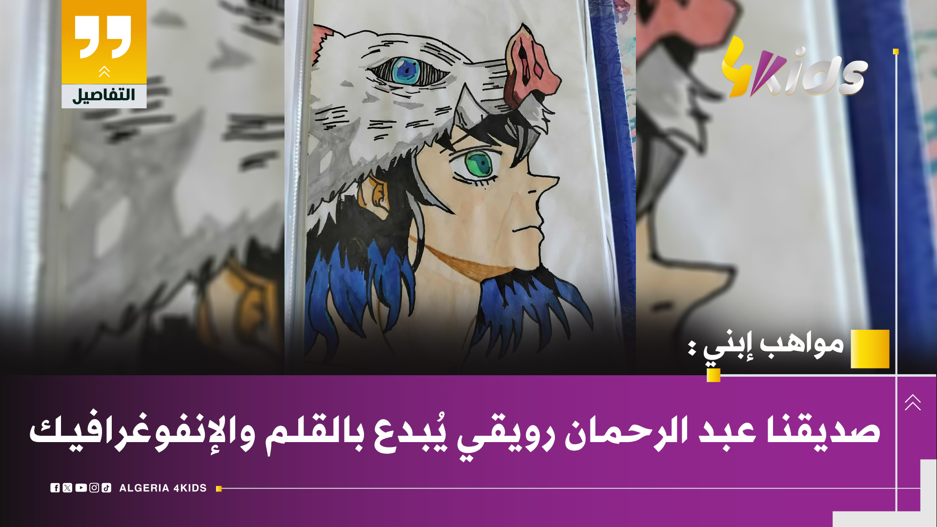 تشجيعًا منا كموقع 4kids لمواهب وابتكارات الأطفال، نود أن نشارككم اليوم إبداعًا فنيًا من أحد الأوفياء لموقعنا وقناتنا، حيث نشهد موهبة مذهلة لرسم صديقنا المبدع عبد الرحمان رويڨي ، التي سجلت معنا مجددا في عمود مواهب ابني. الاسم: عبد الرحمان اللقب: رويڨي السن: 10 سنة الولاية: الجزائر العاصمة 4kids، كمنصة داعمة لمواهب الأطفال، تفتخر بوجود مثل هذه الإبداعات،...