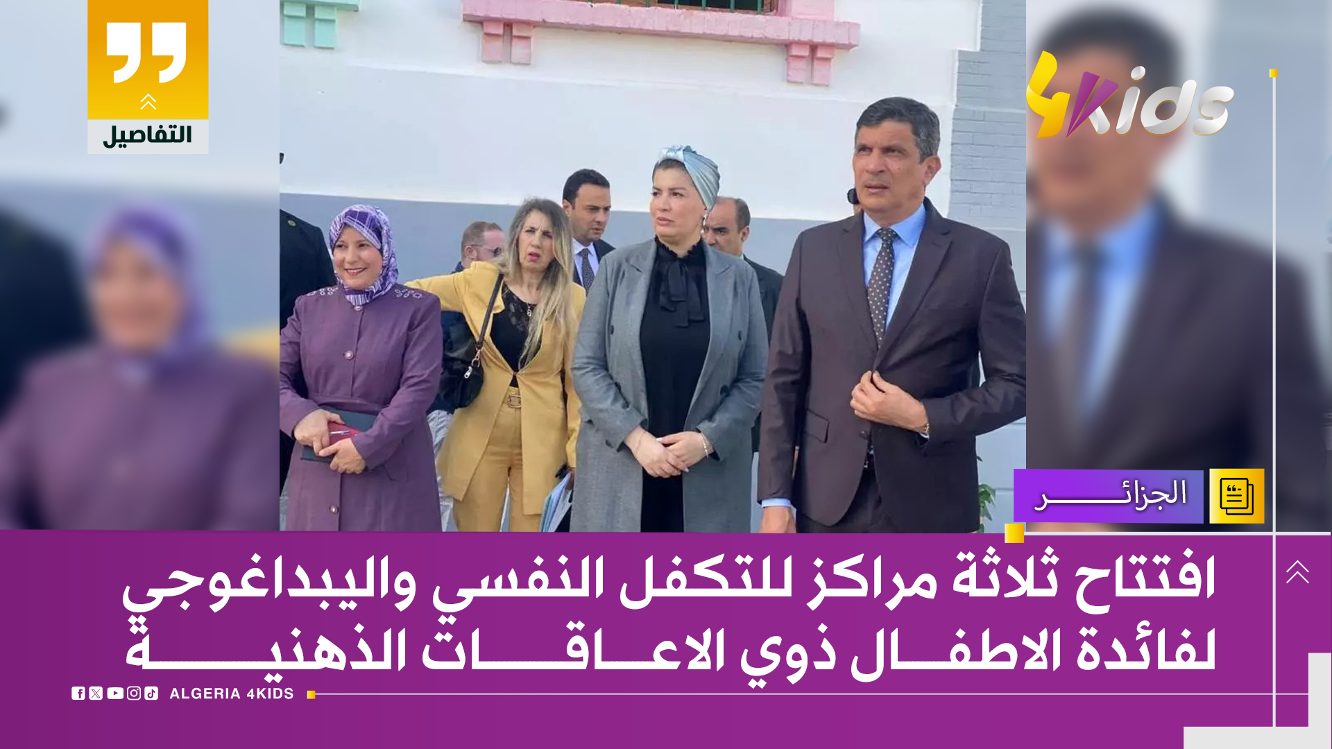 اقرأ المزيدالجزائر – أشرف الوزير, والي ولاية الجزائر, السيد, محمد عبد النور رابحي, رفقة وزيرة التضامن الوطني والأسرة وقضايا المرأة, السيدة, صورية مولوجي, يوم الثلاثاء بالجزائر العاصمة على افتتاح ثلاثة (3) مراكز نفسية بيداغوجية لفائدة الاطفال ذوي الاعاقات الذهنية. و يتزامن افتتاح هذه المراكز المتواجدة ببلديات حسين داي, بولوغين وسيدي امحمد, مع الدخول الاجتماعي والمدرسي, وهذا...