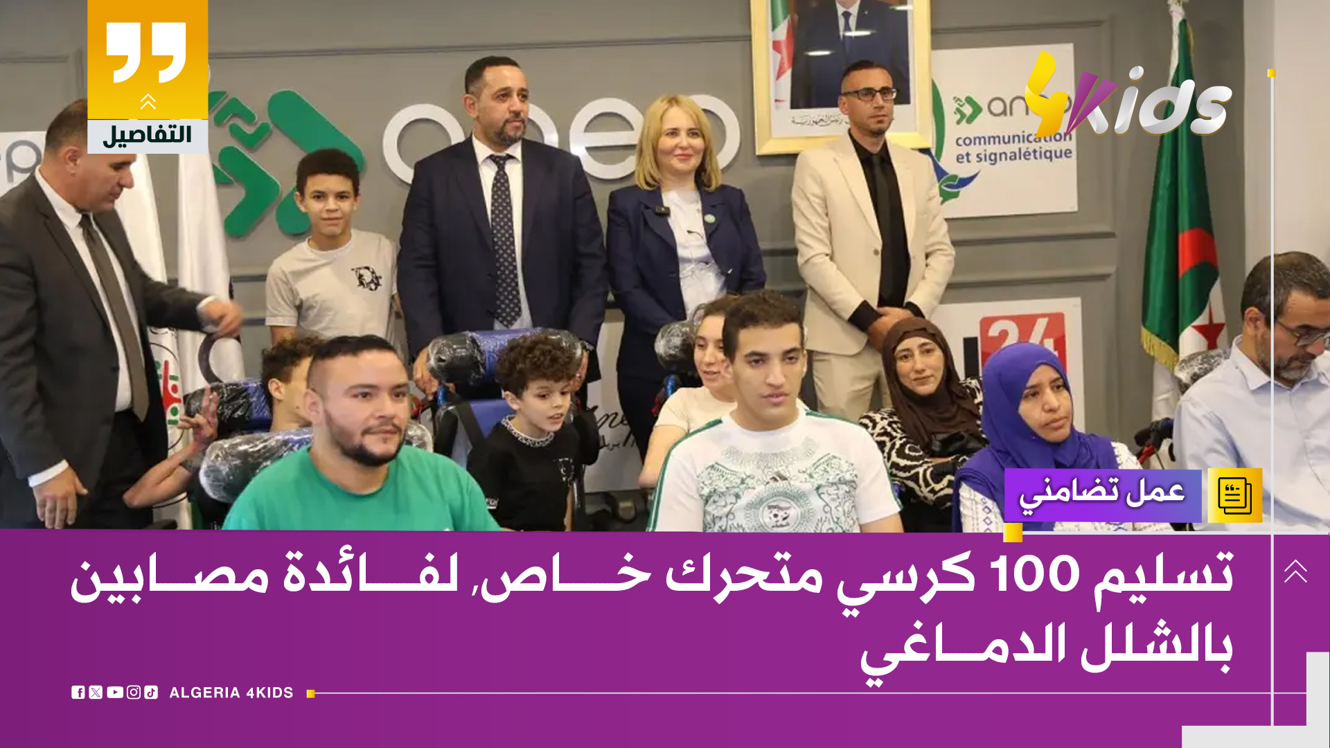 أشرف الرئيس المدير العام للمؤسسة الوطنية للإتصال والنشر والإشهار, السيد مسعود ألغم برفقة رئيسة المرصد الوطني للمجتمع المدني, السيدة ابتسام حملاوي بالجزائر العاصمة على تسليم 100 كرسي متحرك خاص, لفائدة المصابين بالشلل الدماغي من أطفال وبالغين من 28 ولاية من الوطن. و تأتي هذه العملية حسب المبادرين بها, تجسيدا لنتائج اللقاء الوطني لجمعيات ذوي الإحتياجات...