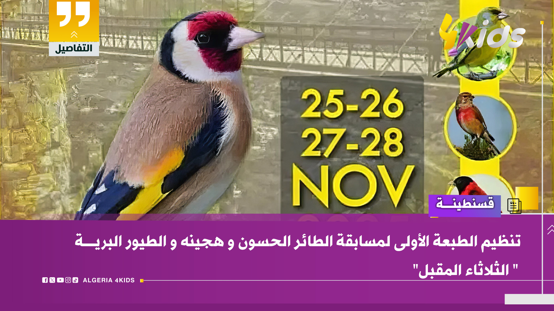 ستنظم بداية من ” الثلاثاء المقبل” مسابقة ومعرض لطيور الزينة, المخصصة لطائر الحسون وهجينه والطيور البرية الأخرى, وذلك بدار البيئة بقسنطينة, حسب ما علم اليوم الجمعة من نائب رئيس الجمعية الولائية لعلم الطيور والبيئة و رئيس لجنة التنظيم لهذا الحدث أمين فريطس. و استنادا لذات المصدر, فإن هذه المسابقة الوطنية التي تحمل اسم “الريشة البرية”,...