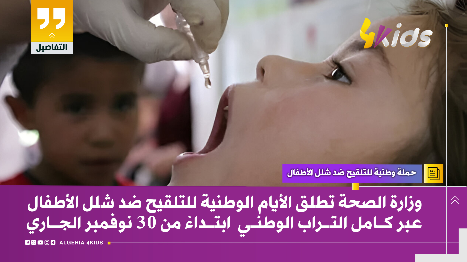 أعلنت وزارة الصحة، اليوم الأحد، عن انطلاق المرحلة الثانية من الحملة الوطنية للتلقيح ضد شلل الأطفال عبر كافة ولايات القطر الوطني. وتأتي هذه العملية، التي تمتد من 21 إلى 27 ديسمبر 2025، في إطار تعزيز الاستراتيجية الوطنية للوقاية الصحية وحماية الأجيال الناشئة من المخاطر المرضية. كما تندرج هذه الحملة ضمن التزامات الجزائر الدولية والوطنية في...